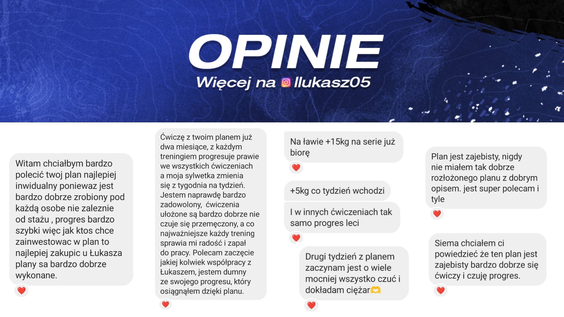 "Plan jest mega. Czucie mięśniowe i pompa super, siła i rozmiary do przodu. Serdecznie polecam"